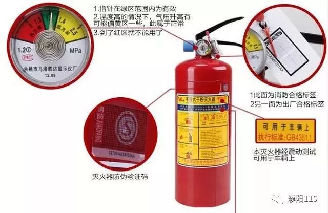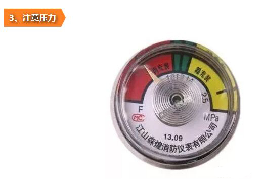 【24】灭火器压力表分为红、黄、绿三个区域,压力指针达不到绿色区域的为不合格产品。压力指示器的种类应与该灭火器的种类相符,充装量大于3公斤的灭火器应配有喷射软管;灭火器应安装保险销,且保险销的铅封(塑料带、线封)应完好无损,否则为不合格产品。