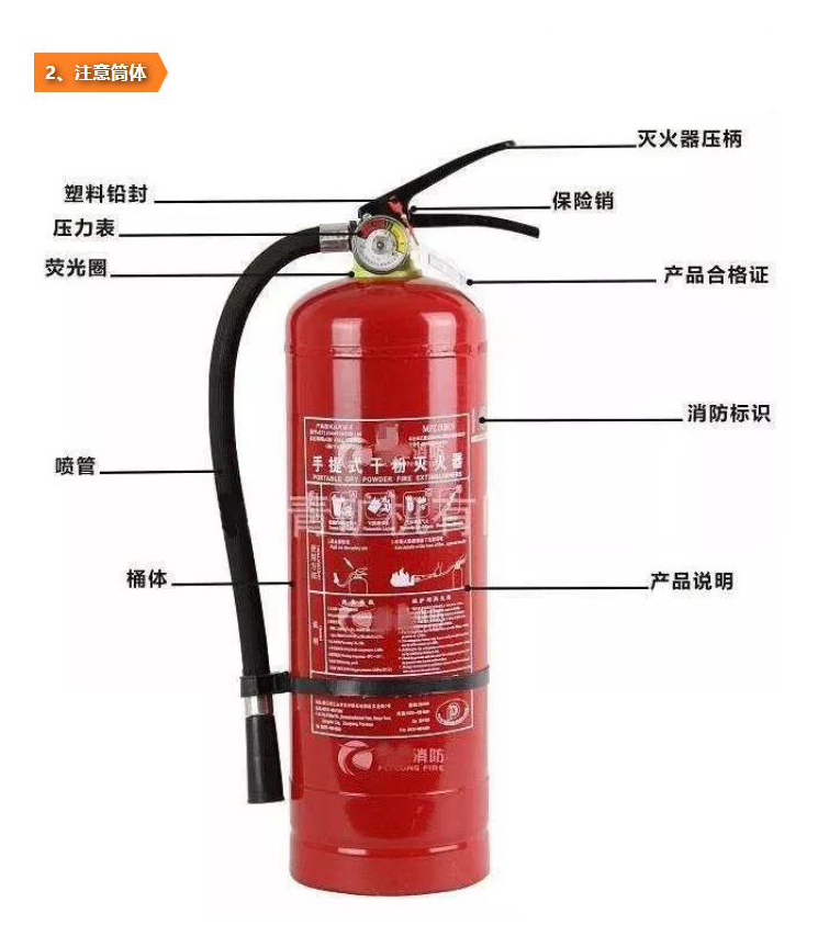 【17】手提式干粉灭火器瓶体上的商标应端正、不缺边少字,无明显皱褶、气泡等缺陷,灭火剂、驱动气体的种类、充装压力、总质量、灭火级别、操作方法、注意事项、制造厂商名字和生产日期说明齐全,必须有“灭火器一经开启,不得重复使用、充装”的警示性文字说明,内容不全的,一般为不合格。