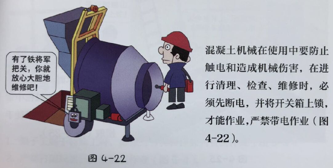 | 【50】混凝土机械(搅拌机)在使用中要防止触电和造成机械伤害,在进行清理、检查、维修时,必须先断电,并将开关箱上锁,才能作业,严禁带电作业。 |